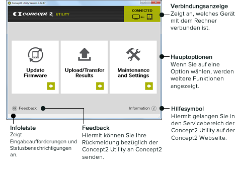Funktionen der Benutzeroberfläche Geräte verbinden PM3, PM4 oder PM5 mit Ihrem Rechner verbinden Ein Kartenlesegerät mit Ihrem Rechner verbinden USB-Stick anschliessen Trainingsdaten Hochladen/Übertragen Übertragen von LogCard-Daten in eine Tabelle Hochladen der Trainingsdaten in ein Online-Logbuch Mit der Ergebnisliste arbeiten Standardeinstellungen für Gerätetyp und Gewichtsklasse wählen Firmware aktualisieren Firmware aktualisieren Wartung und Einstellungen Monitor Typ umstellen Installationssprache des Monitors auswählen Concept2 Utility Funktionen der Benutzeroberfläche